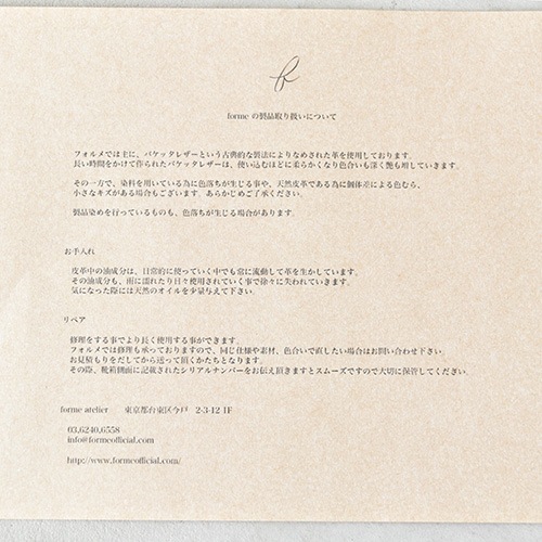 | attention | 天然皮革の特性上、革の表面にはシボ、シワ、シミ、キズ等が見受けられますが 天然皮革ならではの特性として、予めご了承くださいませ。 |