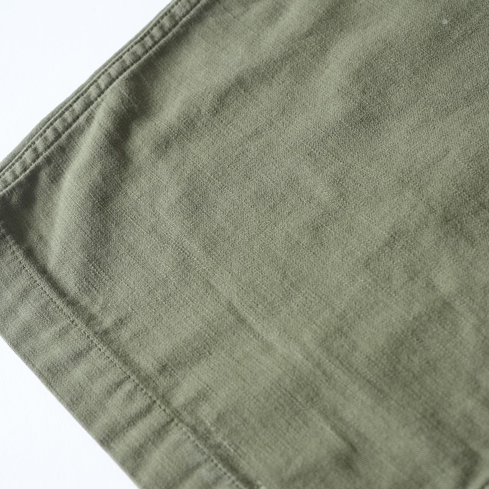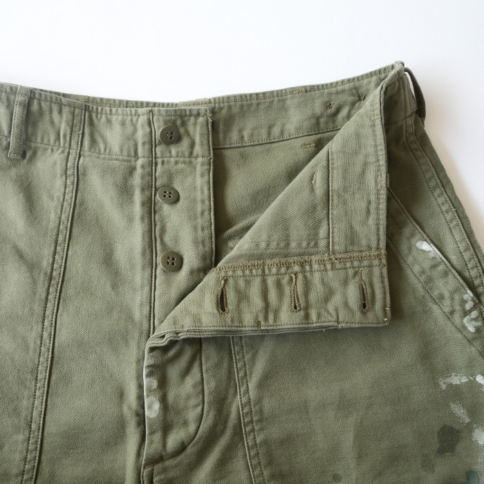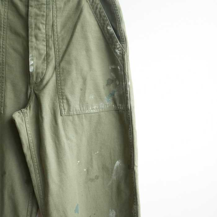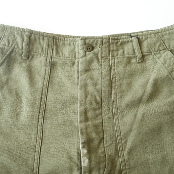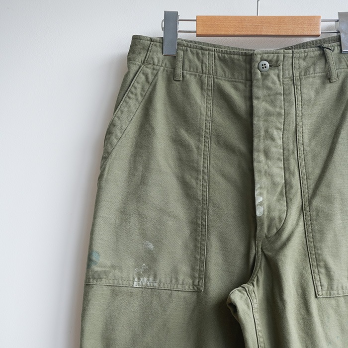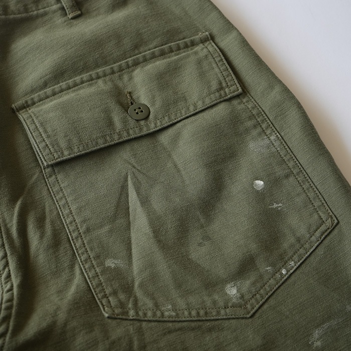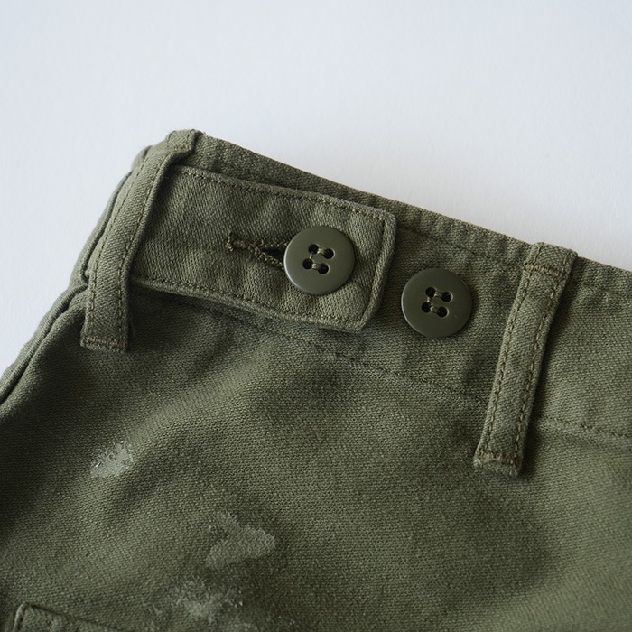 ‐ BAKER PANTS - 一点一点職人が加工しておりレアリティが高く着こなしのアクセントに。 軍パンの中ではポケット数が少なく落ち着いたデザインはコーディネートに取り入れやすいです。 コットンサテンの生地は柔く履き心地が良く、ヴィンテージの風合いを醸し出します。 ベルトループ・チェーンステッチ・尿素ボタンで仕上げられた本格派で、 ウェスト部のアジャストベルトで、ワンサイズ絞ることも可能。