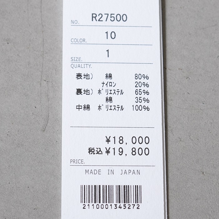 | 素材 | 表地)綿80% ナイロン20% 裏地)ホ゜リエステル65% 綿35% 中綿ポリエステル100% >>素材・生地・加工についての詳細はこちら |