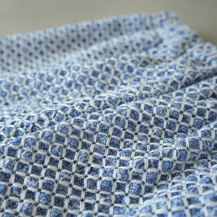鮮やかなブルーで描かれた繊細な小花柄が美しいCharlotteをベースの生地に使用し、