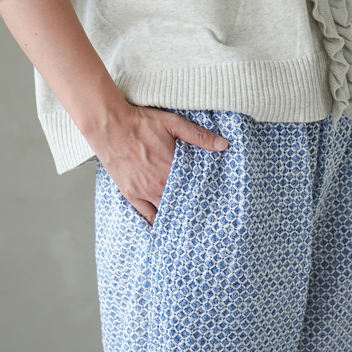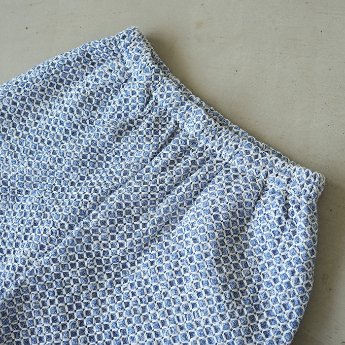 格子状に刺繍が施されたスペシャルな生地のゴムパンツ。