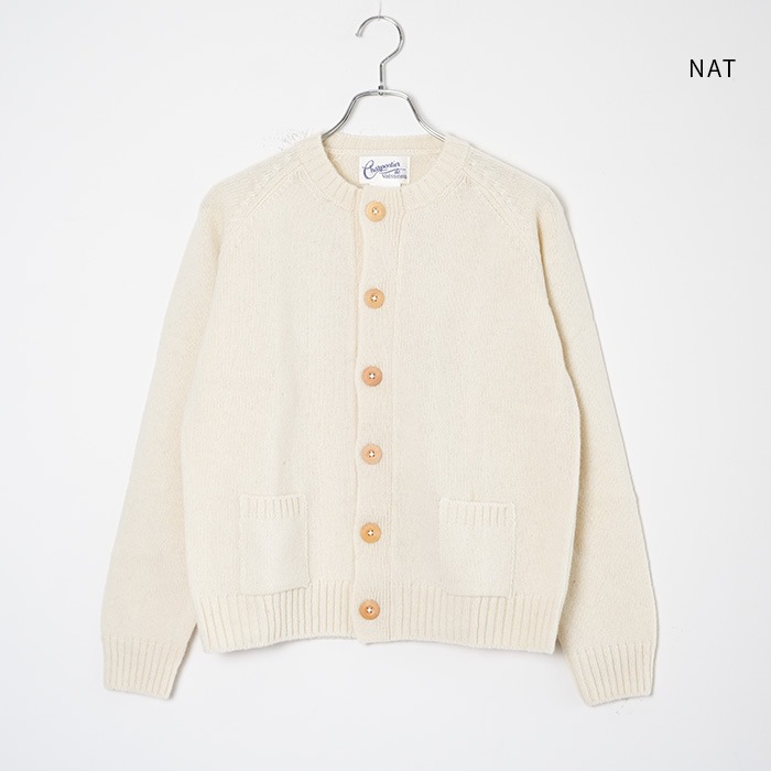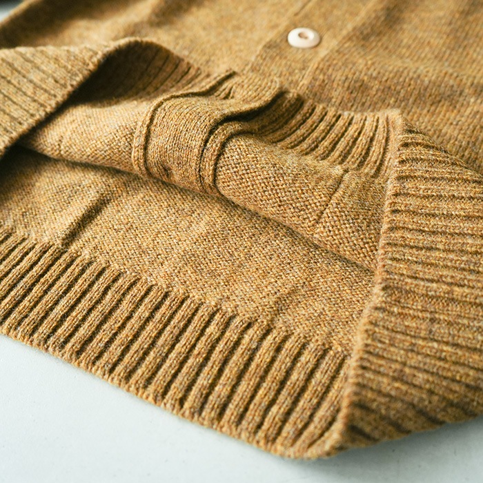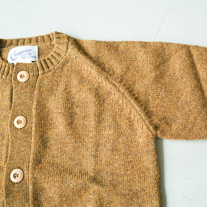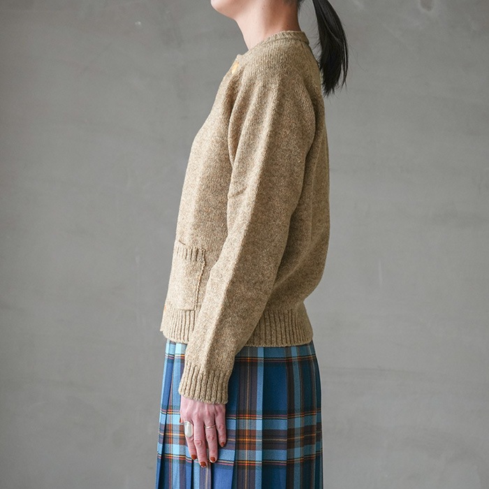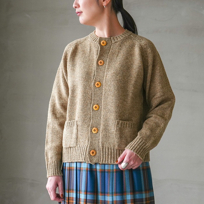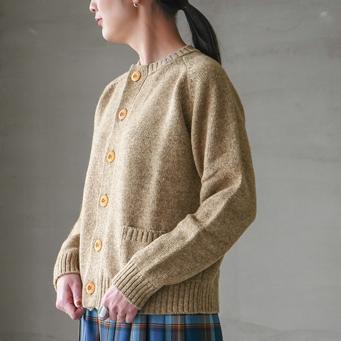 大きめのウッドボタンと小さなポケットがアクセントになったカーディガンは、
