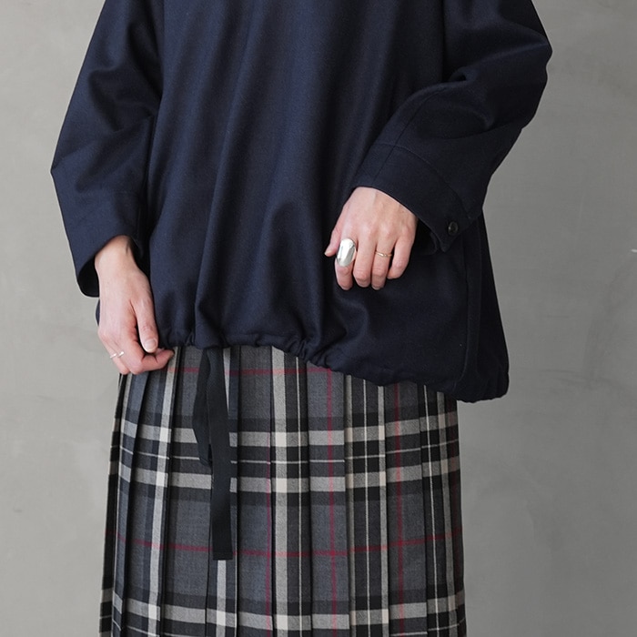 裾のドローストリングを絞ってギャザーを寄せれば、