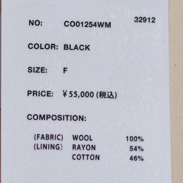 | 素材 | 表地:Wool 100% 裏地:Rayon 54% Cotton 46% |