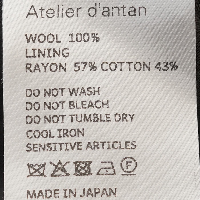 | 素材 | 表地:Wool 100% 裏地:Rayon 57% , Cotton 43% |