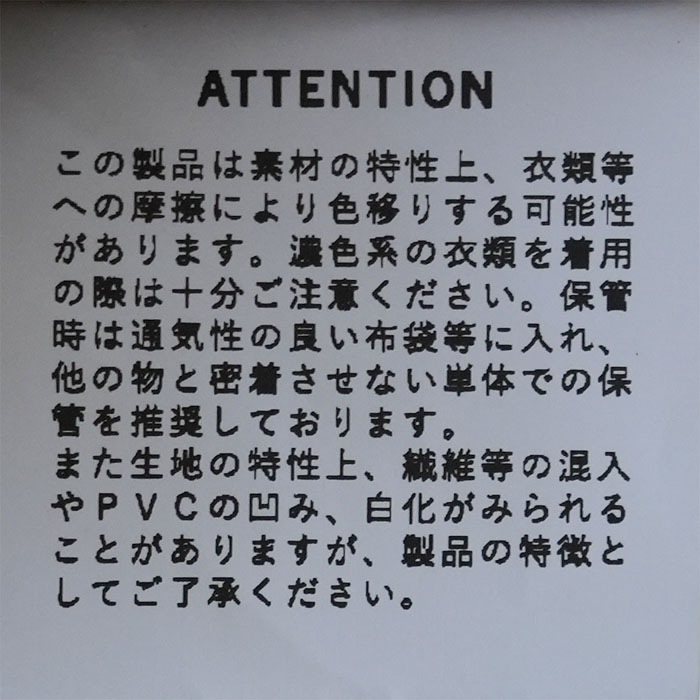 | attention | この製品は水濡れ摩擦等によって色落ちや移染する場合がございますので十分注意してください。 |
